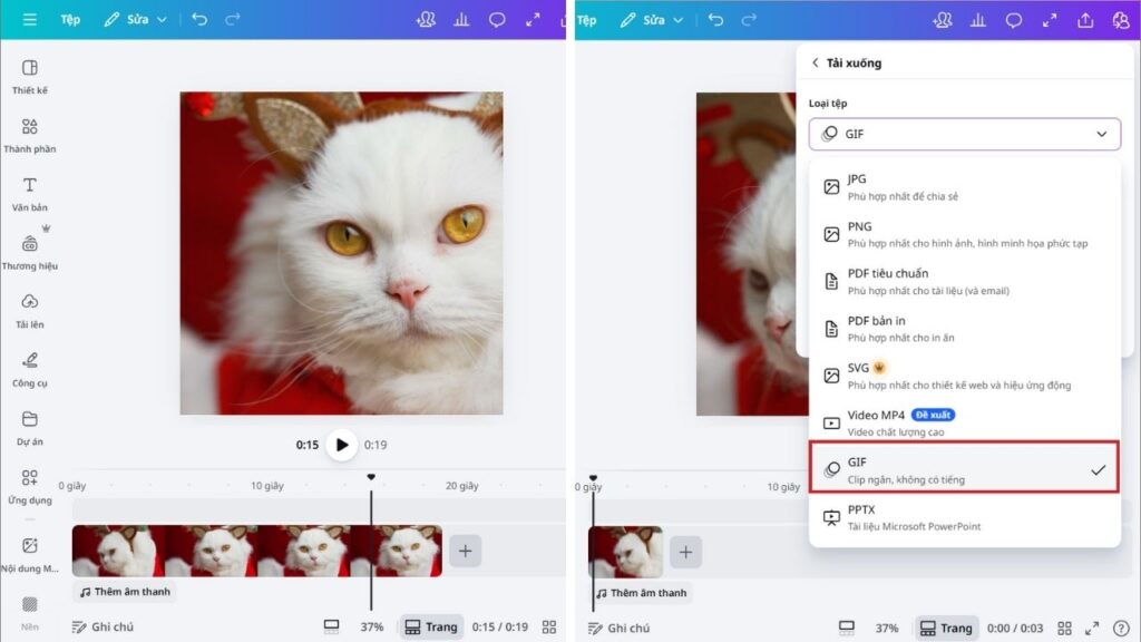 Bạn tiến hành tải video mà bạn muốn tạo thành GIF lên thiết kế, tiếp đến bạn cắt video để lấy đoạn muốn tạo GIF. Sau khi cắt xong, bạn chọn “Tải xuống” và nhấn chọn “GIF”.